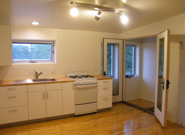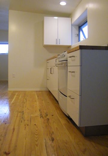 The house has stained concrete floors throughout. Kitchen has stained concrete counter tops and recycled glass tile was used in the back splash. The bathrooms have stained concrete shower walls and tub enclosures instead of tile.