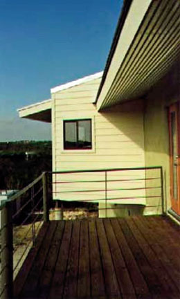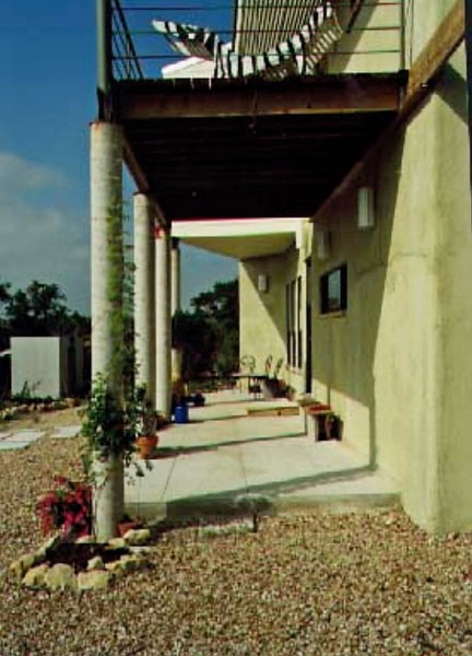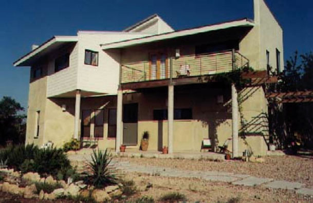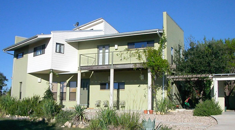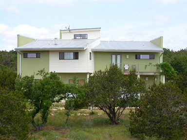 Single Family residence in Southwest Austin, Texas. Walls are made of insulated concrete forms and the roof is 10″ thick structural insulated panels. Part of the master bedroom wall was also made out of the SIPs. The house has metal roof and the current owner has added a 20,000 gallon rainwater collection system. Landscaping has water saving and deer resistant plants. The low water needs of the landscaping and low water fixtures and appliances help keep the water usage down.