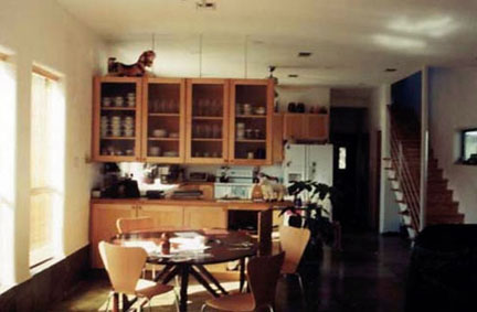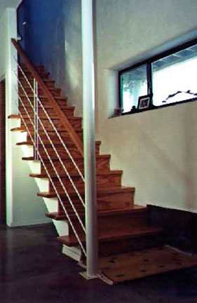 The kitchen has locally made maple wood cabinets. The floors are stained concrete downstairs. Upstairs floors have sustainable carpet. Exterior walls have stucco finish and interior walls were plastered.
